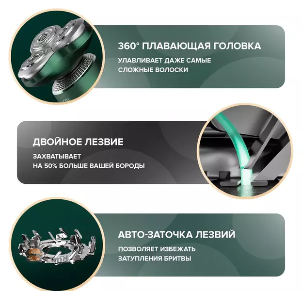 Особенности: двойные лезвия, самозатачивающиеся лезвия, технология IFT вращения на 360°, функция блокировки во время путешествий, LED-дисплей